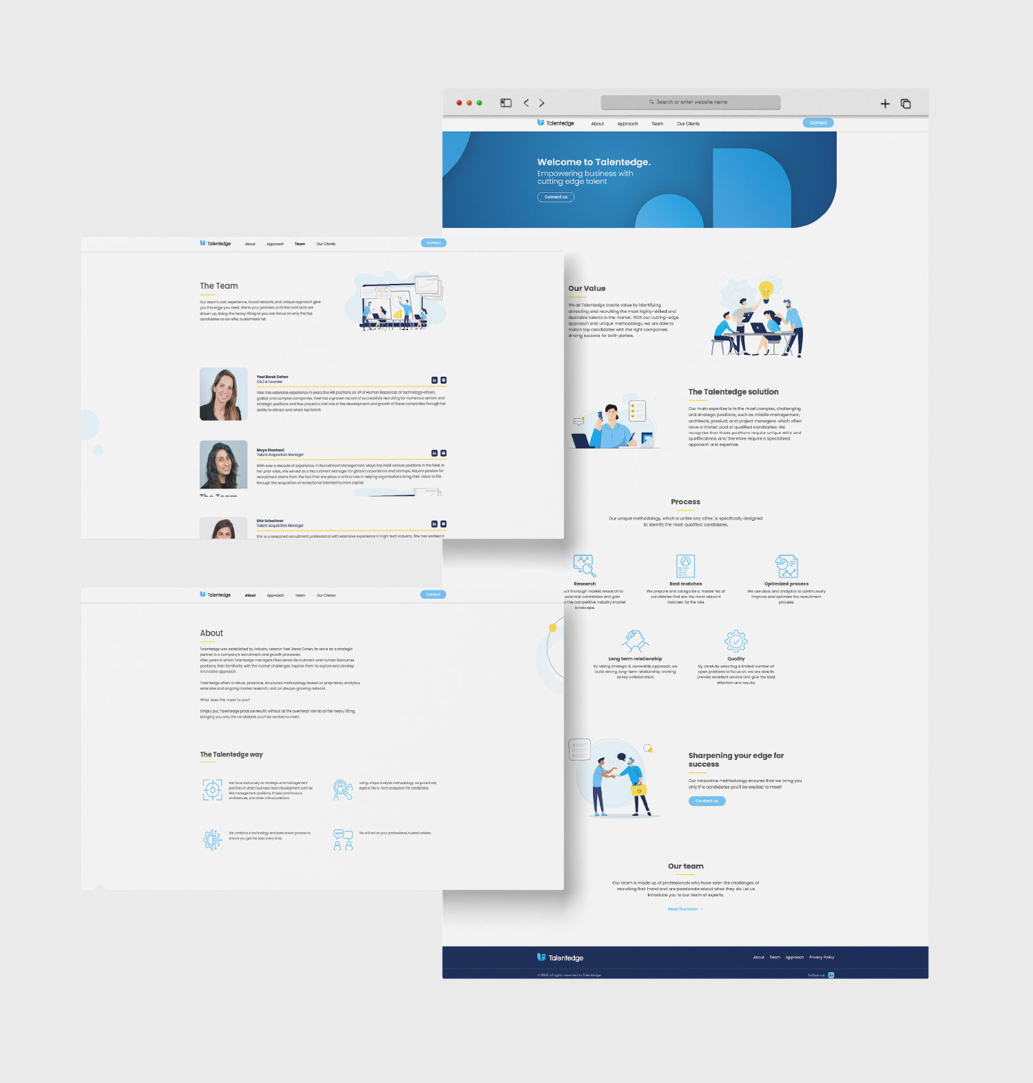 We developed a full visual identity for TelentEdge from the ground up. The branding includes a clean logo, modern design language, and custom illustrations. Inspired by geometric shapes and a fresh, dynamic tone, the brand reflects the company’s innovative approach to tech recruitment.